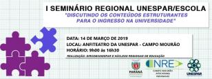 11:00 NRE participa do “I Seminário Regional Unespar/Escola” Nesta quarta-feira (14/03), foi realizado nas dependências da Unespar o I Seminário Regional Unespar/Escola - “Discutindo os conteúdos estruturantes para o ingresso na universidade”.