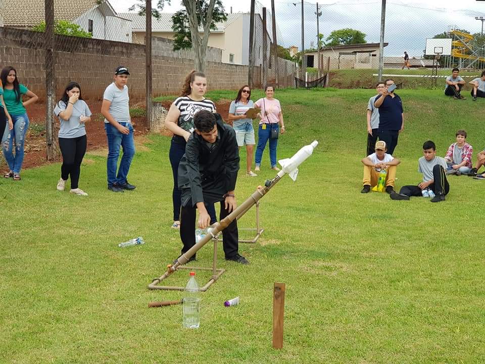 A ação contou com as seguintes atividades para os alunos(as) dos 9° anos do Ensino Fundamental e 1°, 2° e 3° anos do Ensino Médio: palestra sobre a História da astronomia, com o Prof. Dr. Michel Corci Batista – UTFPR e Prof. Taisy Fernandes Vieira – CE Santos Dumont; competição de foguetes com alunos do Ensino Médio dos períodos matutino, vespertino e noturno. O objetivo foi proporcionar para os alunos da educação básica uma oportunidade de vivenciar a astronomia na teoria e na prática. Dentre as diferentes maneiras que esse conteúdo pode ser abordado em sala, ressaltamos a importância da produção de atividades experimentais.